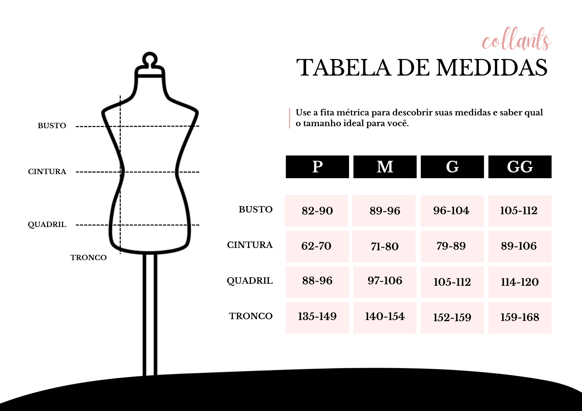 💡 Dica: se você estiver entre dois tamanhos, recomendamos optar pelo maior, garantindo liberdade total nos movimentos e um caimento elegante.